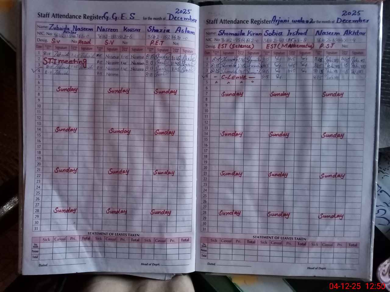 | CNIC | Full Name | Designation | R/C | Absence During Last Calender Month |