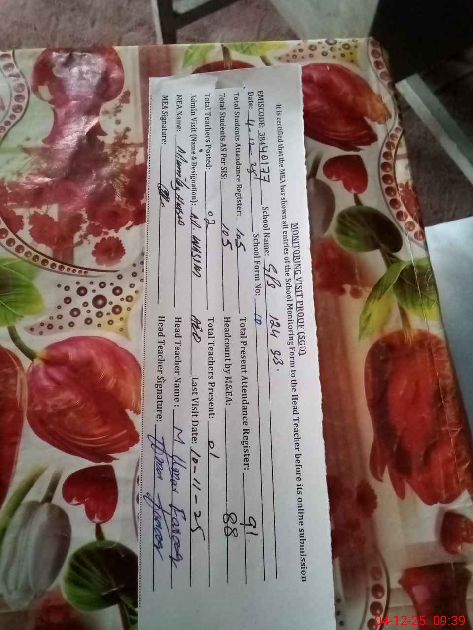 | Attendance Register | Head Teacher | MEA with School | Visit Proof |