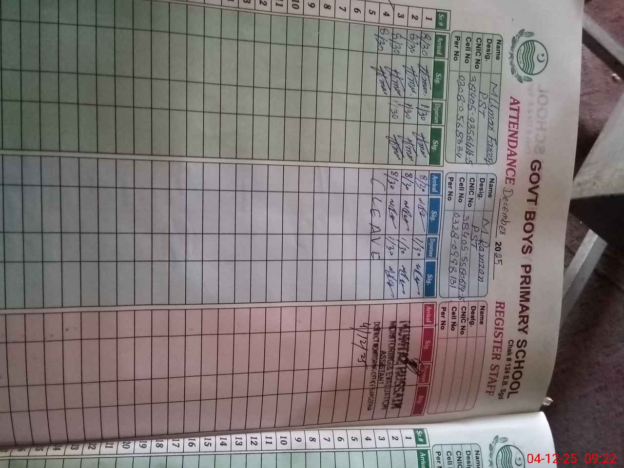 | CNIC | Full Name | Designation | R/C | Absence during last cal. month |