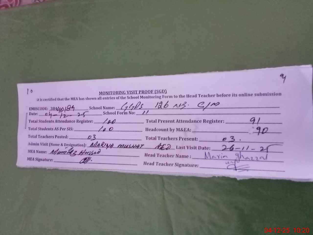 | Attendance Register | Head Teacher | MEA with School | Visit Proof |
