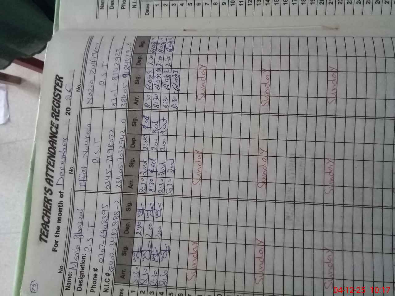 | CNIC | Full Name | Designation | R/C | Absence During Last Calender Month |