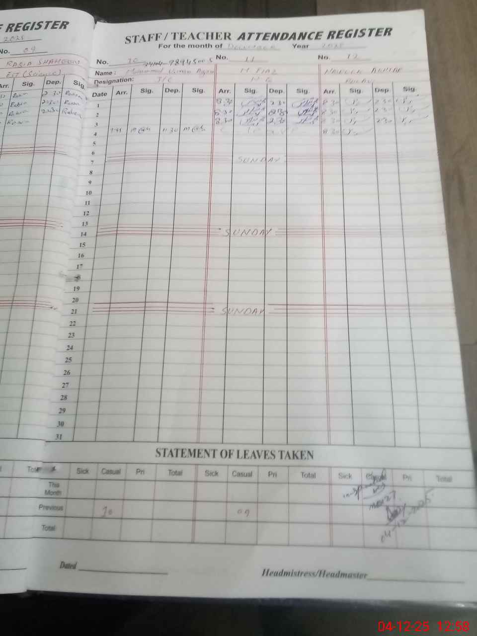 | CNIC | Full Name | Designation | R/C | Absence During Last Calender Month |