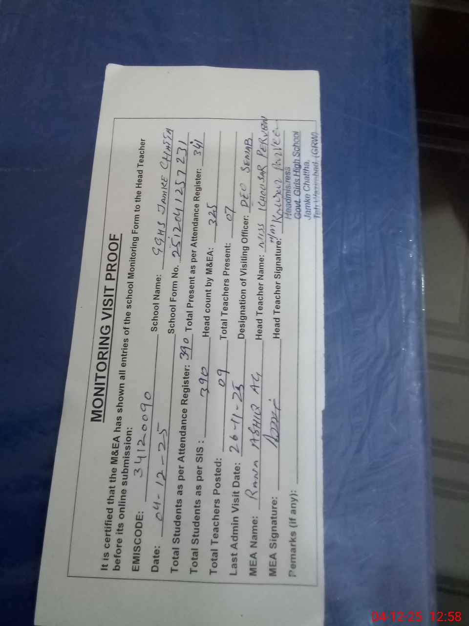 | Attendance Register | Head Teacher | MEA with School | Visit Proof |