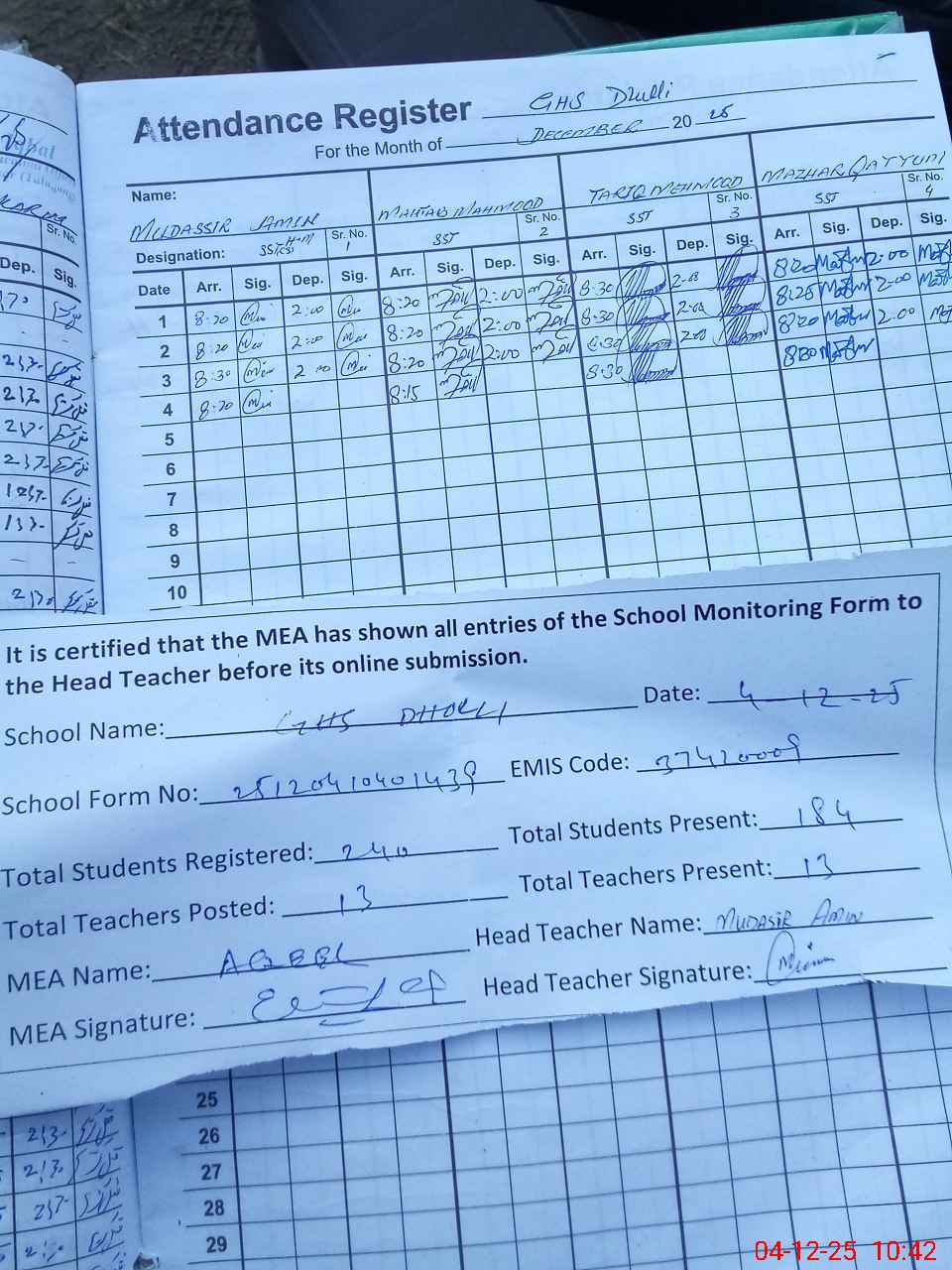 | Attendance Register | Head Teacher | MEA with School | Visit Proof |