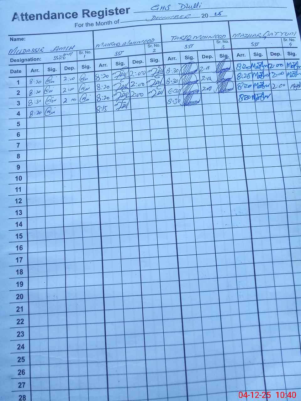 | CNIC | Full Name | Designation | R/C | Absence During Last Calender Month |