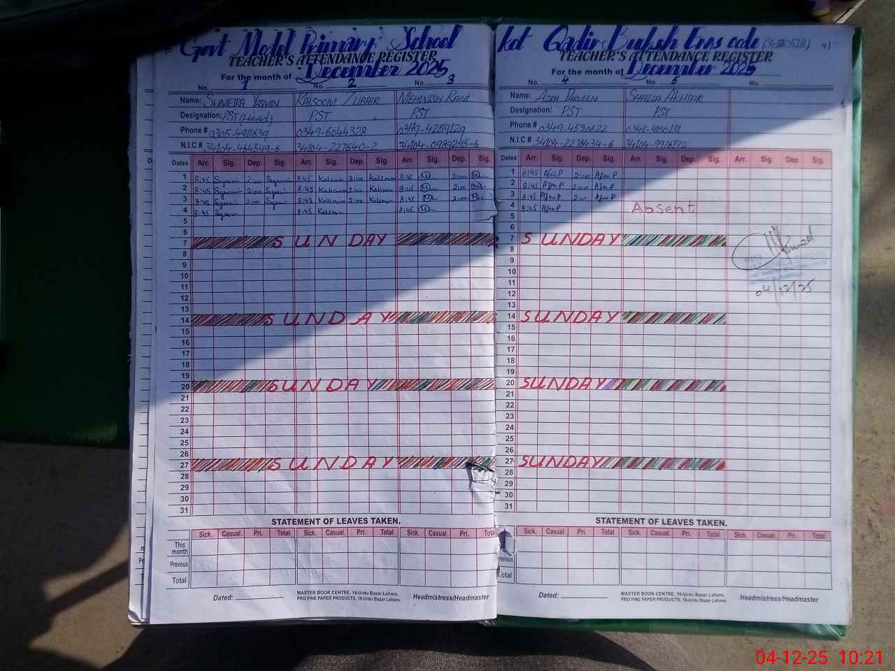 | Remarks (Use Separate Page if Required): Teacher Shazia Akhter PST absent from 10 May 2025 Teacher Kalsoom Zubair not present in school her presence was marked in attendance register | |||||