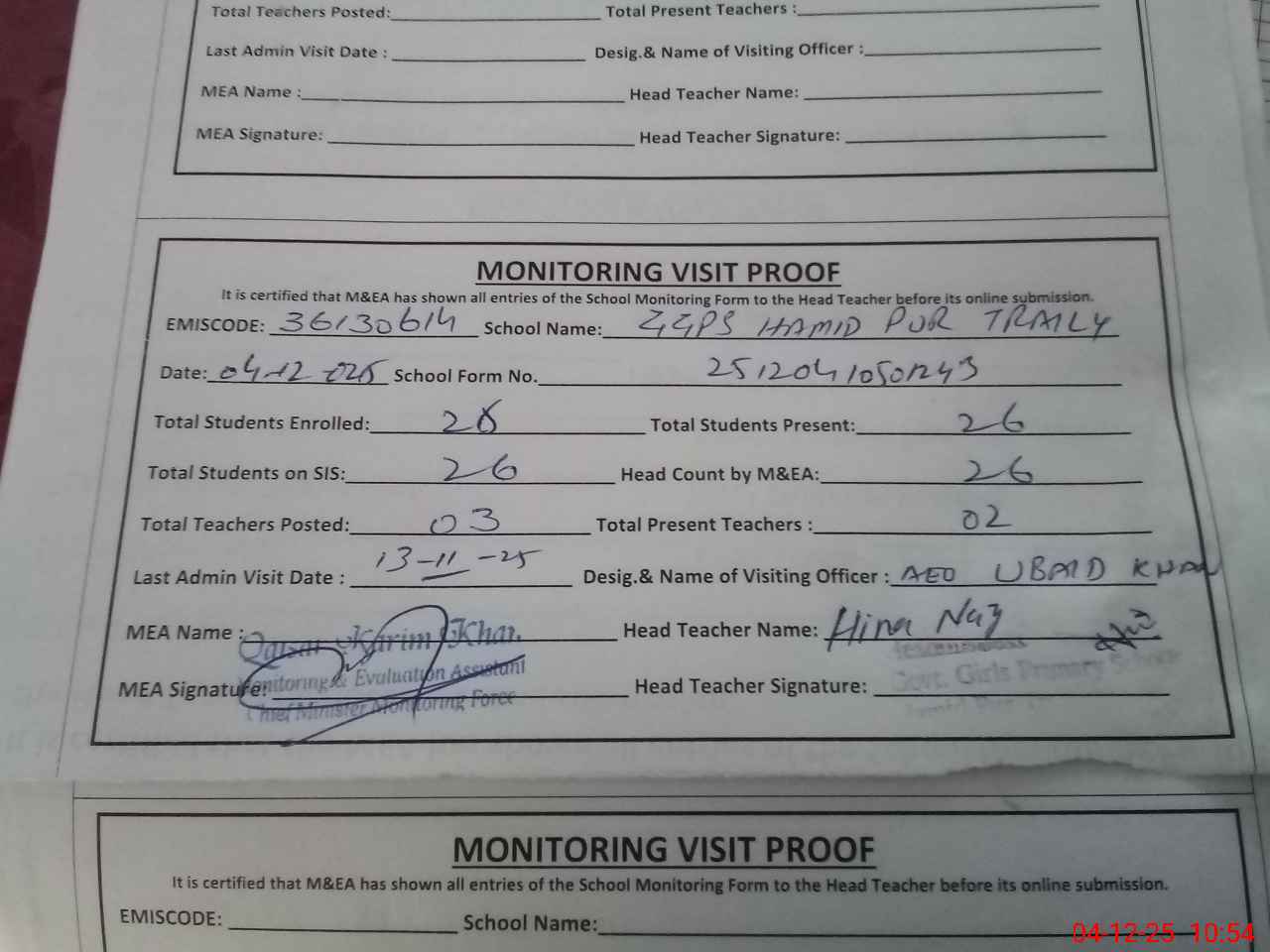 | Attendance Register | Head Teacher | MEA with School | Visit Proof |