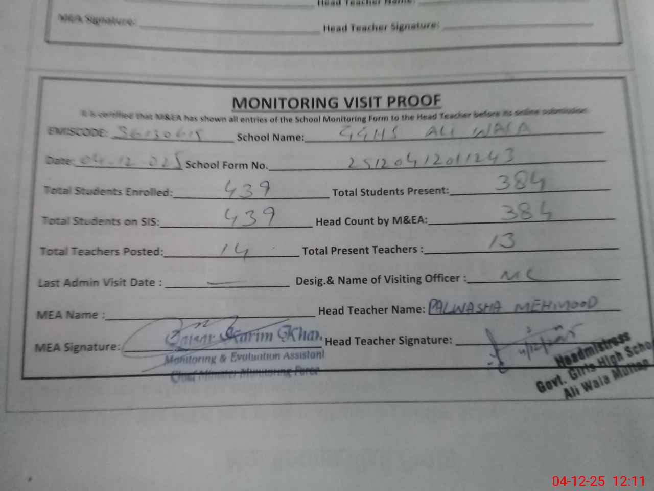 | EMIS Code: 36130615 | Name of School: GGHS ALI WALA MULTAN | |||