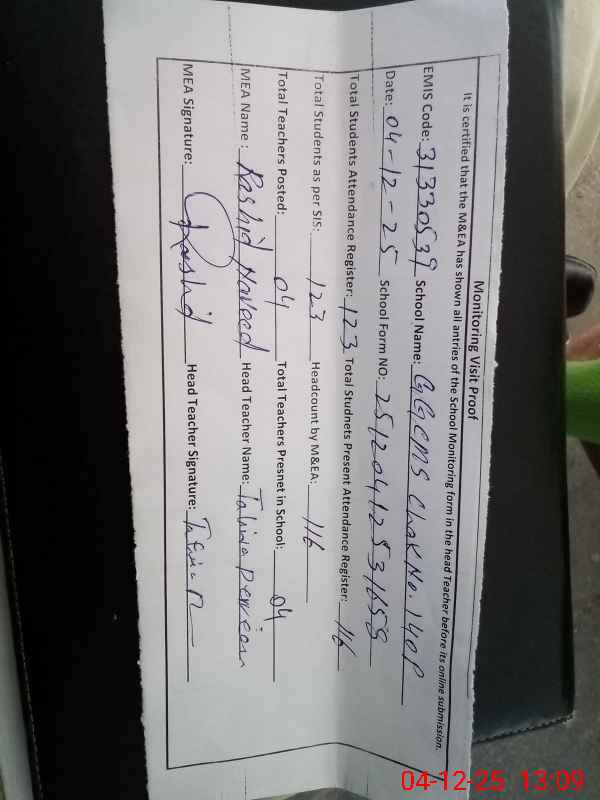 | Attendance Register | Head Teacher | MEA with School | Visit Proof |