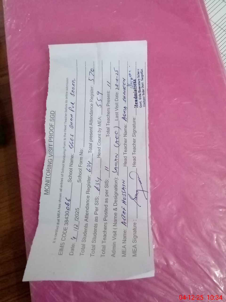 | Attendance Register | Head Teacher | MEA with School | Visit Proof |