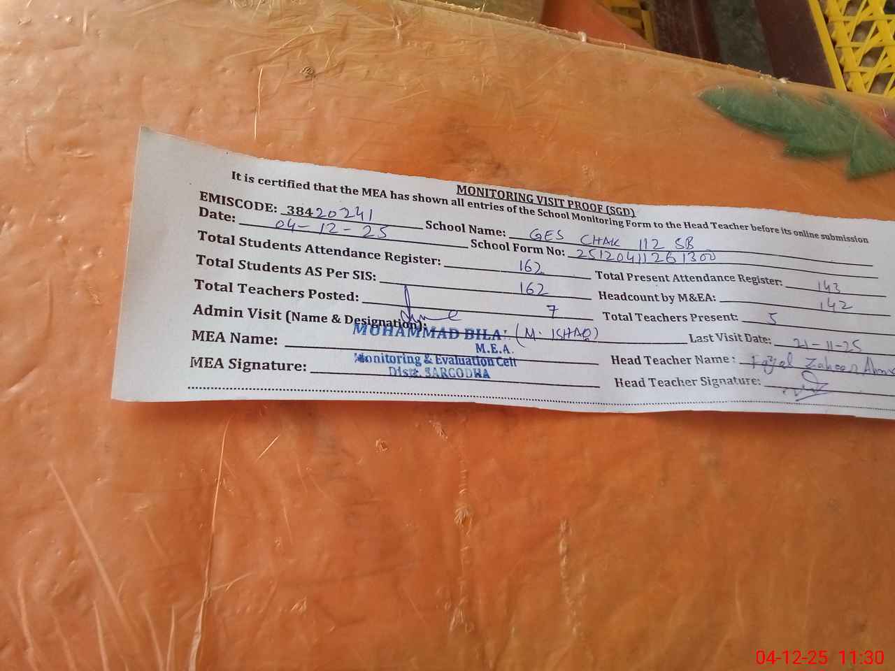 | Attendance Register | Head Teacher | MEA with School | Visit Proof |