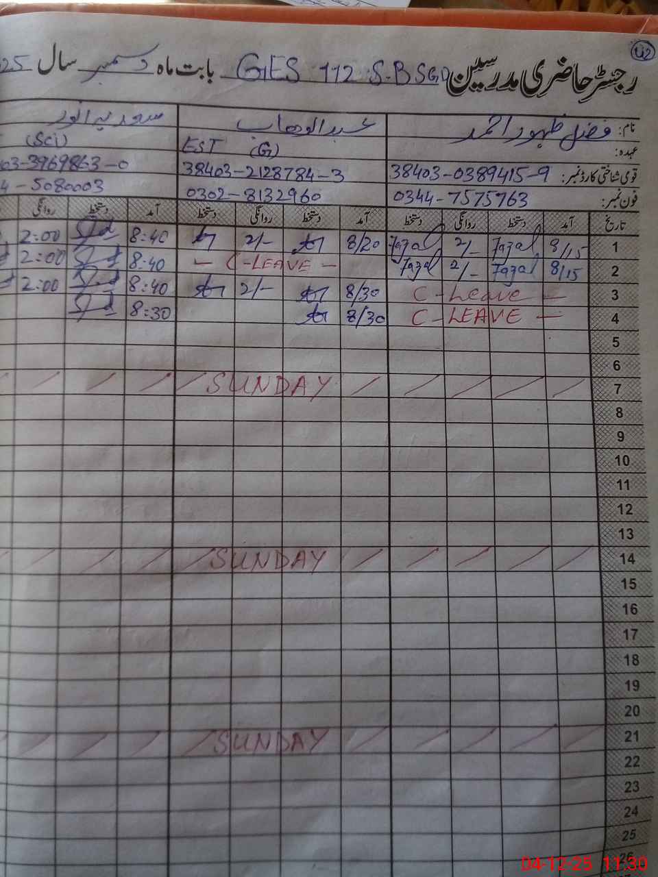 | CNIC | Full Name | Designation | R/C | Absence during last cal. month |