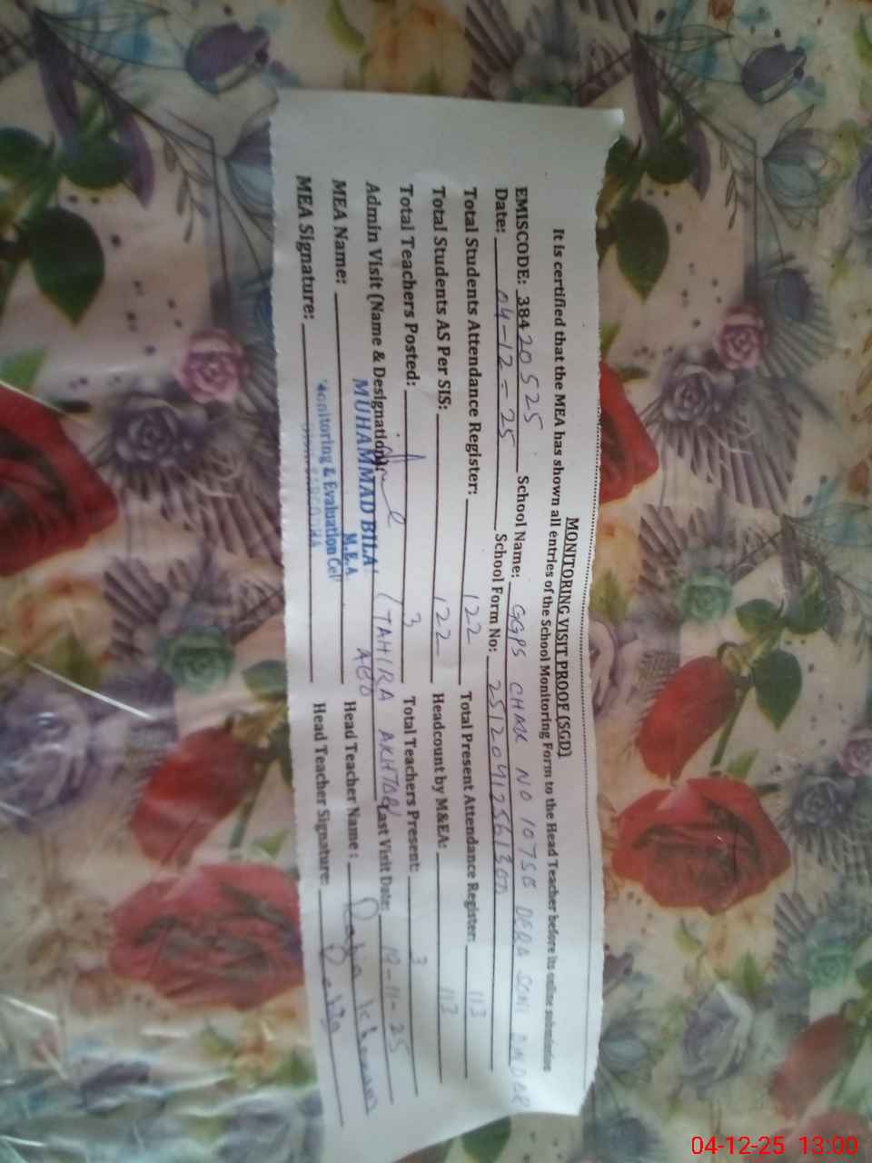 | EMIS Code: 38420525 | Name of School: GGPS CHAK NO.107 SB DERA SONI DIN DAR | |||