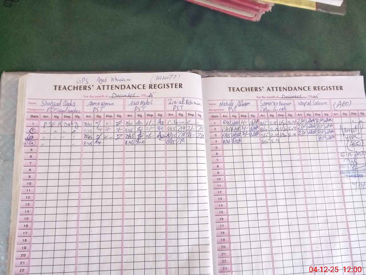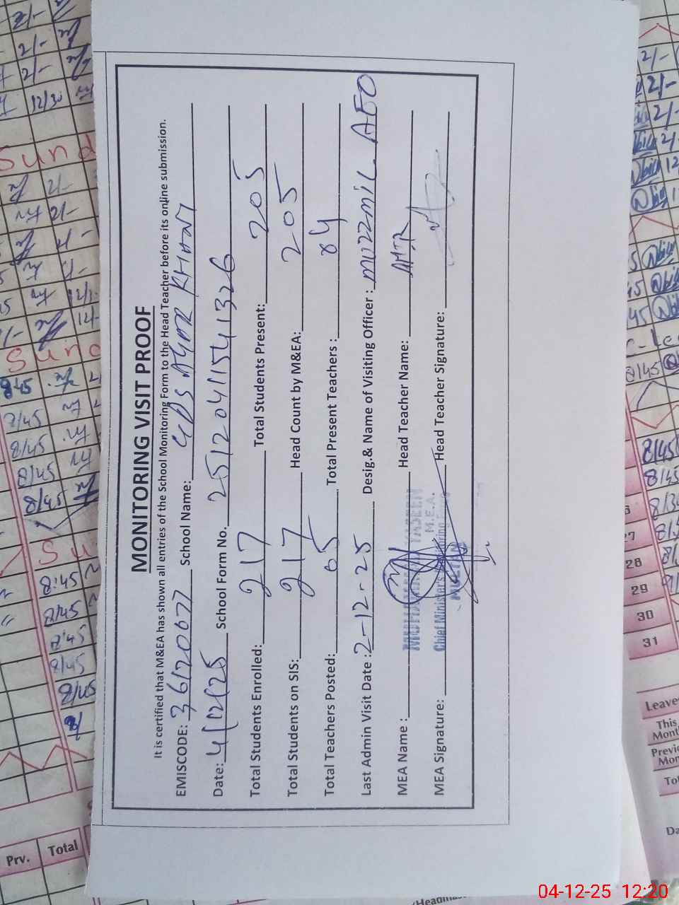 | Attendance Register | Head Teacher | MEA with School | Visit Proof |