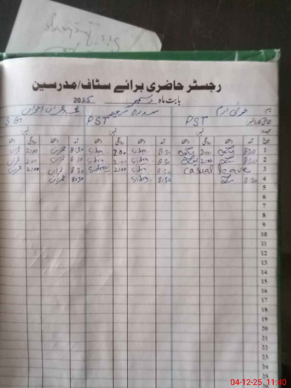 | CNIC | Full Name | Designation | R/C | Absence During Last Calender Month |