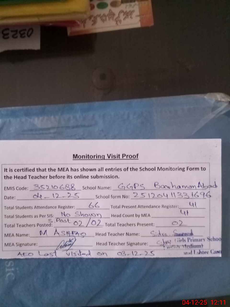 | Attendance Register | Head Teacher | MEA with School | Visit Proof |