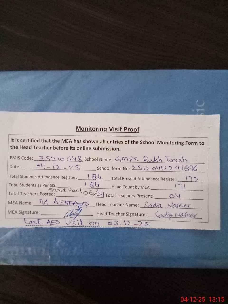 | Remarks (Use Separate Page if Required): Teachers Sanctioned Post 06 and Filled 04 Last visit of AEO Sabah Ehsan on 03-12-25 Paint work not up to standard for all classrooms 35210648 | |||||