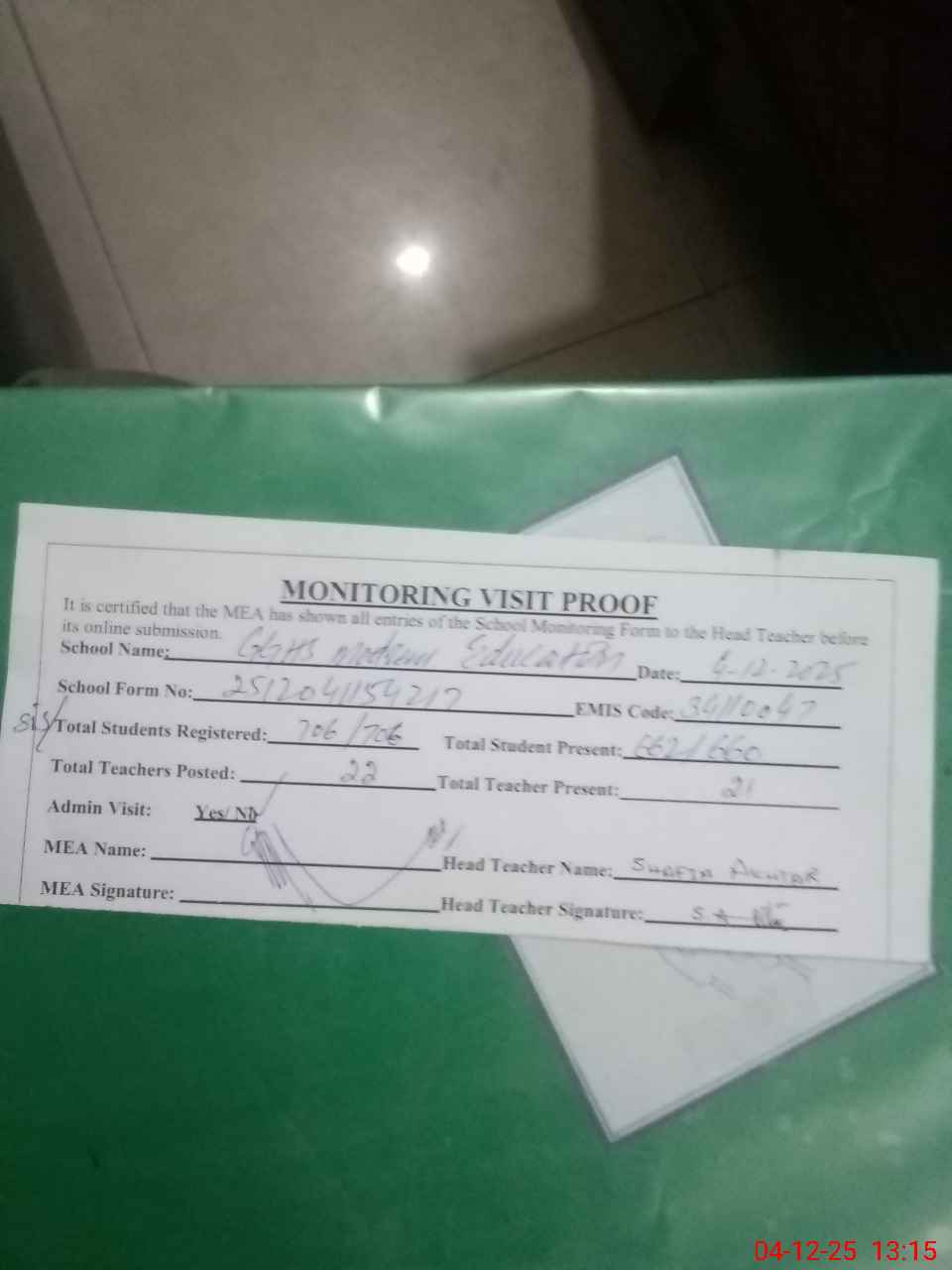 | Attendance Register | Head Teacher | MEA with School | Visit Proof |