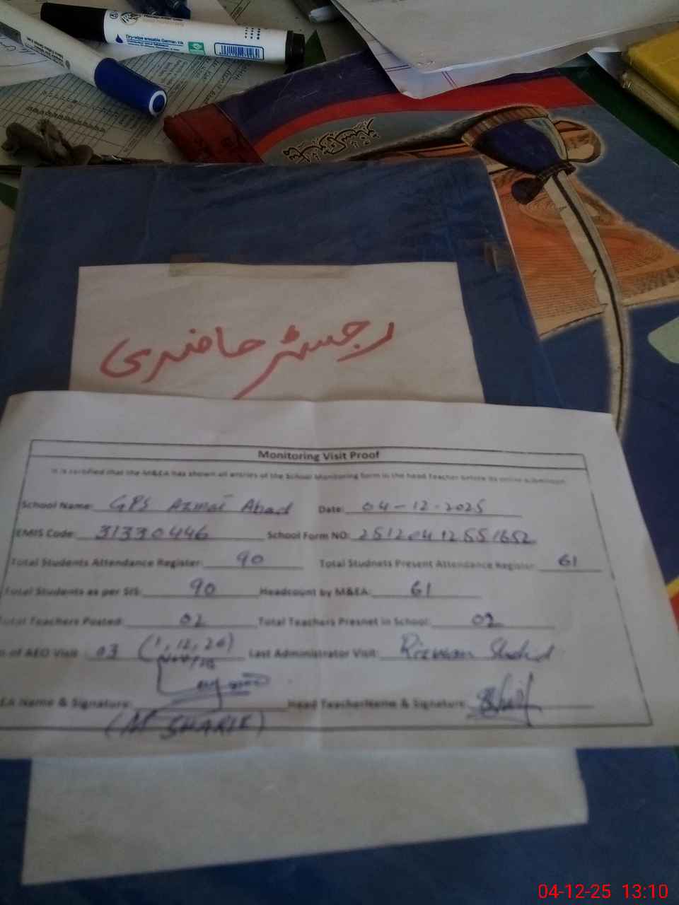 | Attendance Register | Head Teacher | MEA with School | Visit Proof |