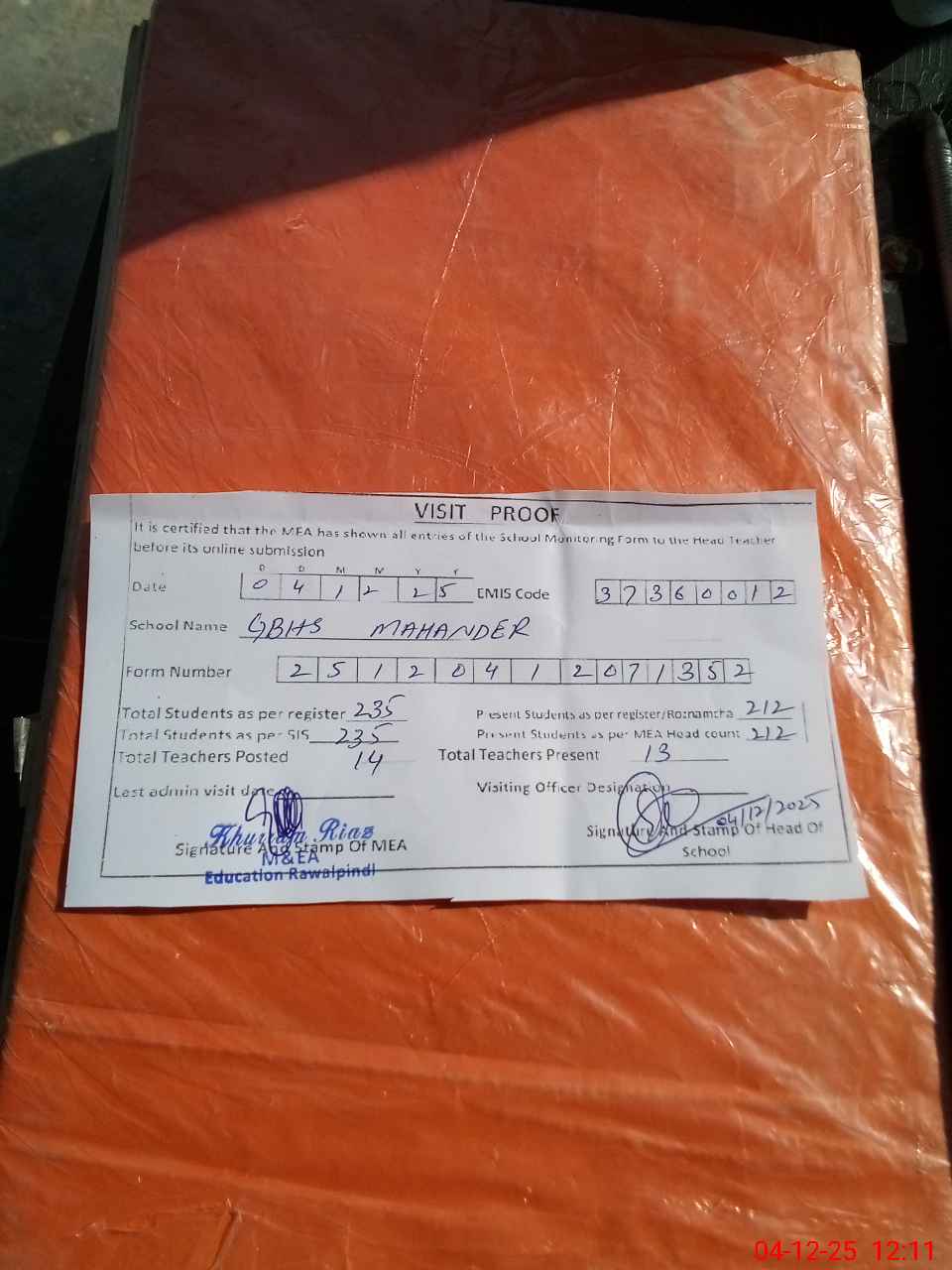 | Attendance Register | Head Teacher | MEA with School | Visit Proof |