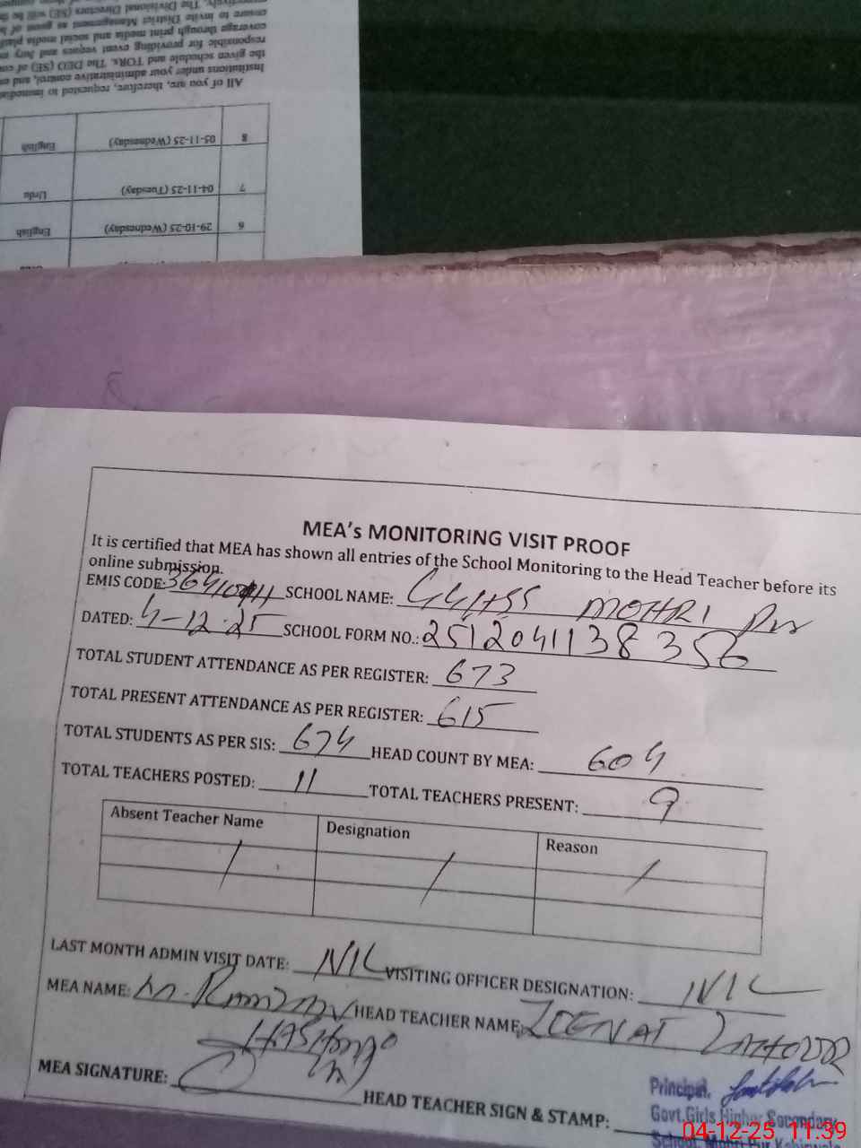 | Attendance Register | Head Teacher | MEA with School | Visit Proof |