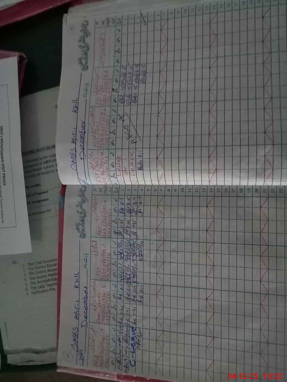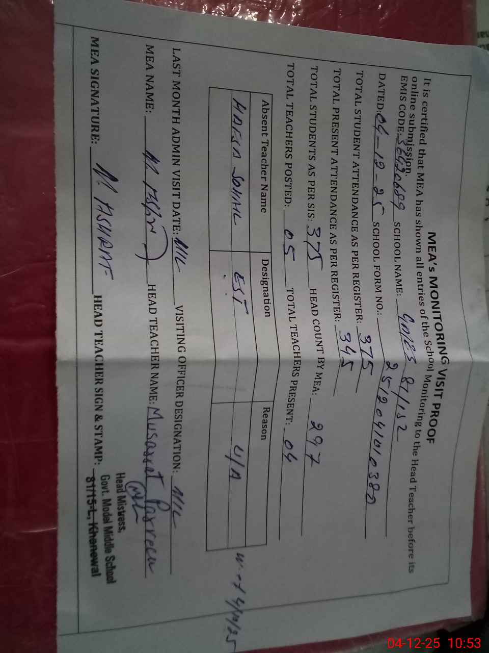 | Attendance Register | Head Teacher | MEA with School | Visit Proof |