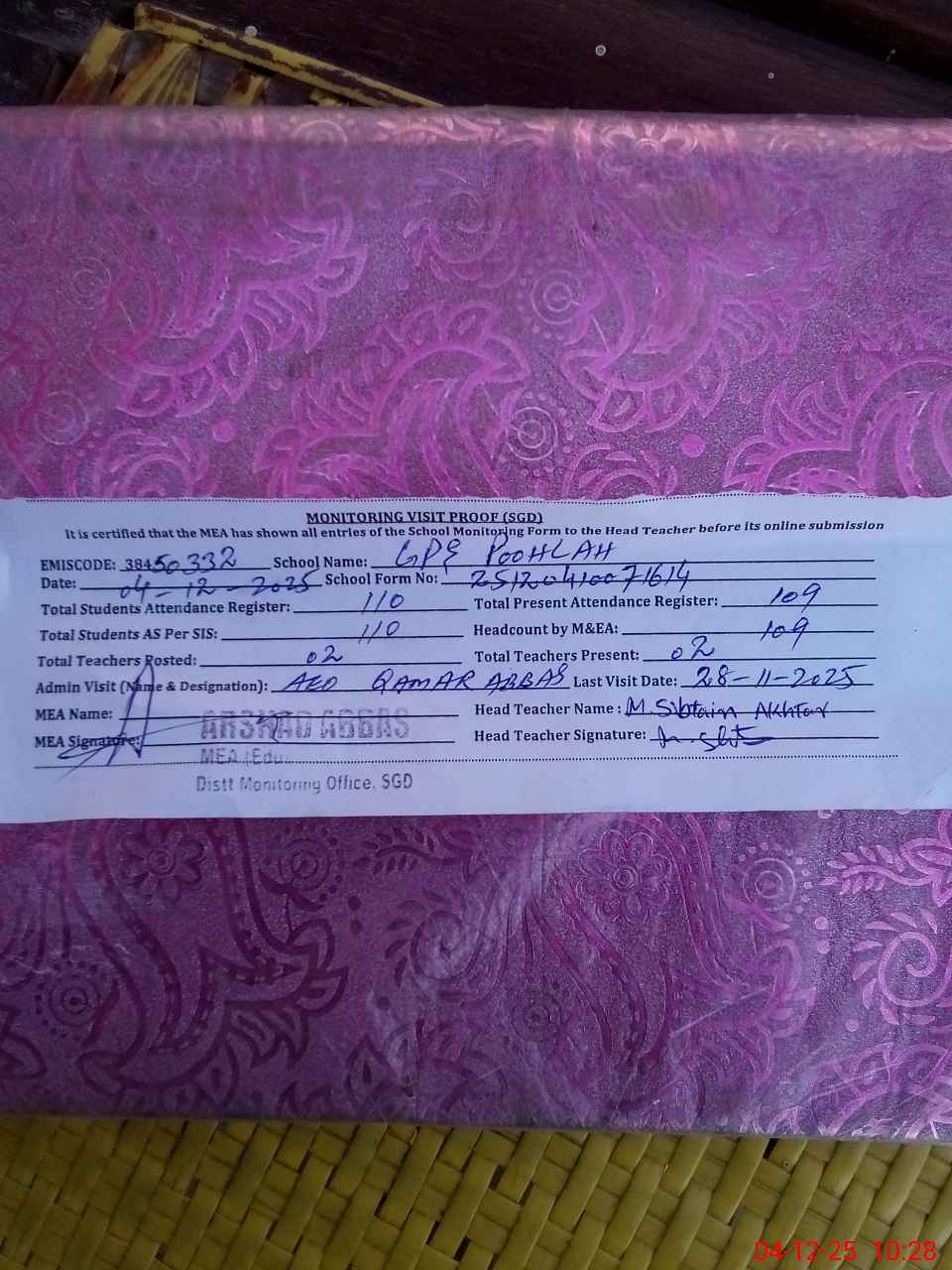 | Attendance Register | Head Teacher | MEA with School | Visit Proof |