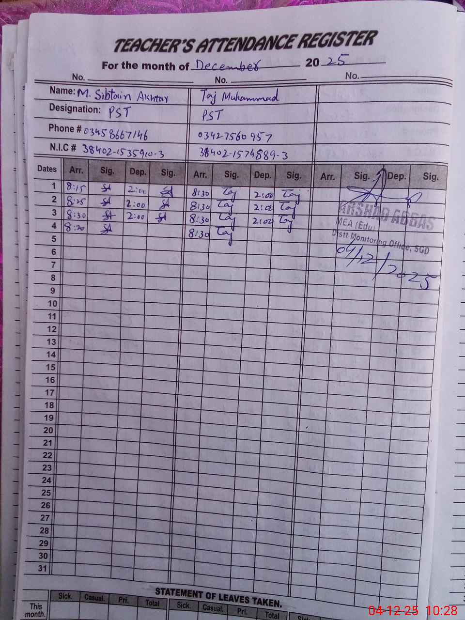 | CNIC | Full Name | Designation | R/C | Absence During Last Calender Month |