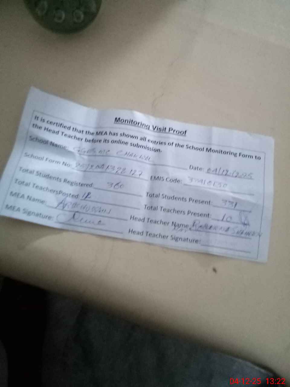 | Attendance Register | Head Teacher | MEA with School | Visit Proof |