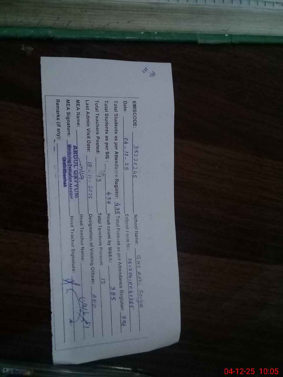 | Attendance Register | Head Teacher | MEA with School | Visit Proof |