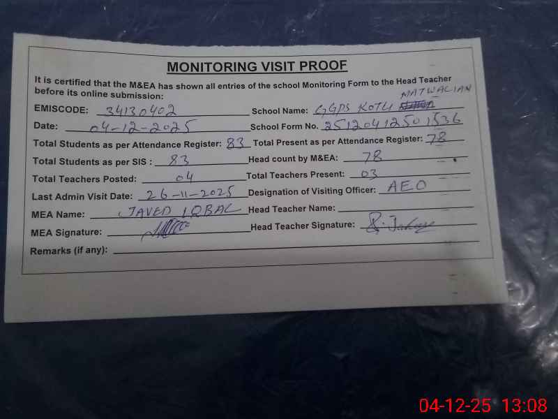 | EMIS Code: 34130402 | Name of School: GGPS KOTLI MATWALLIAN | |||