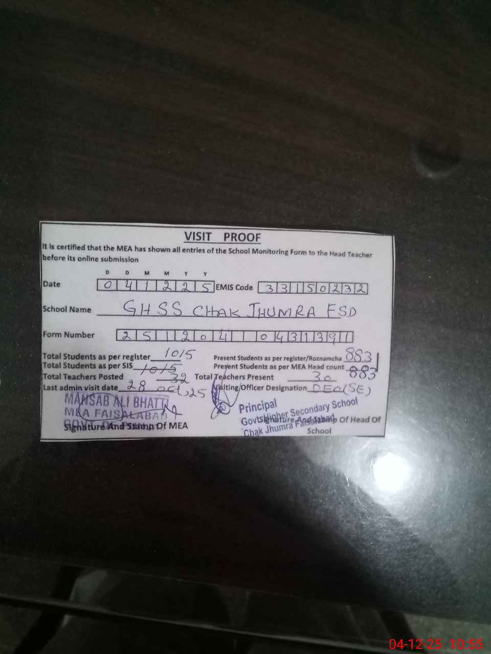| Attendance Register | Head Teacher | MEA with School | Visit Proof |