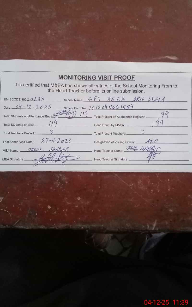 | EMIS Code: 39220233 | Name of School: GPS 86 EB ARIF WALA | |||