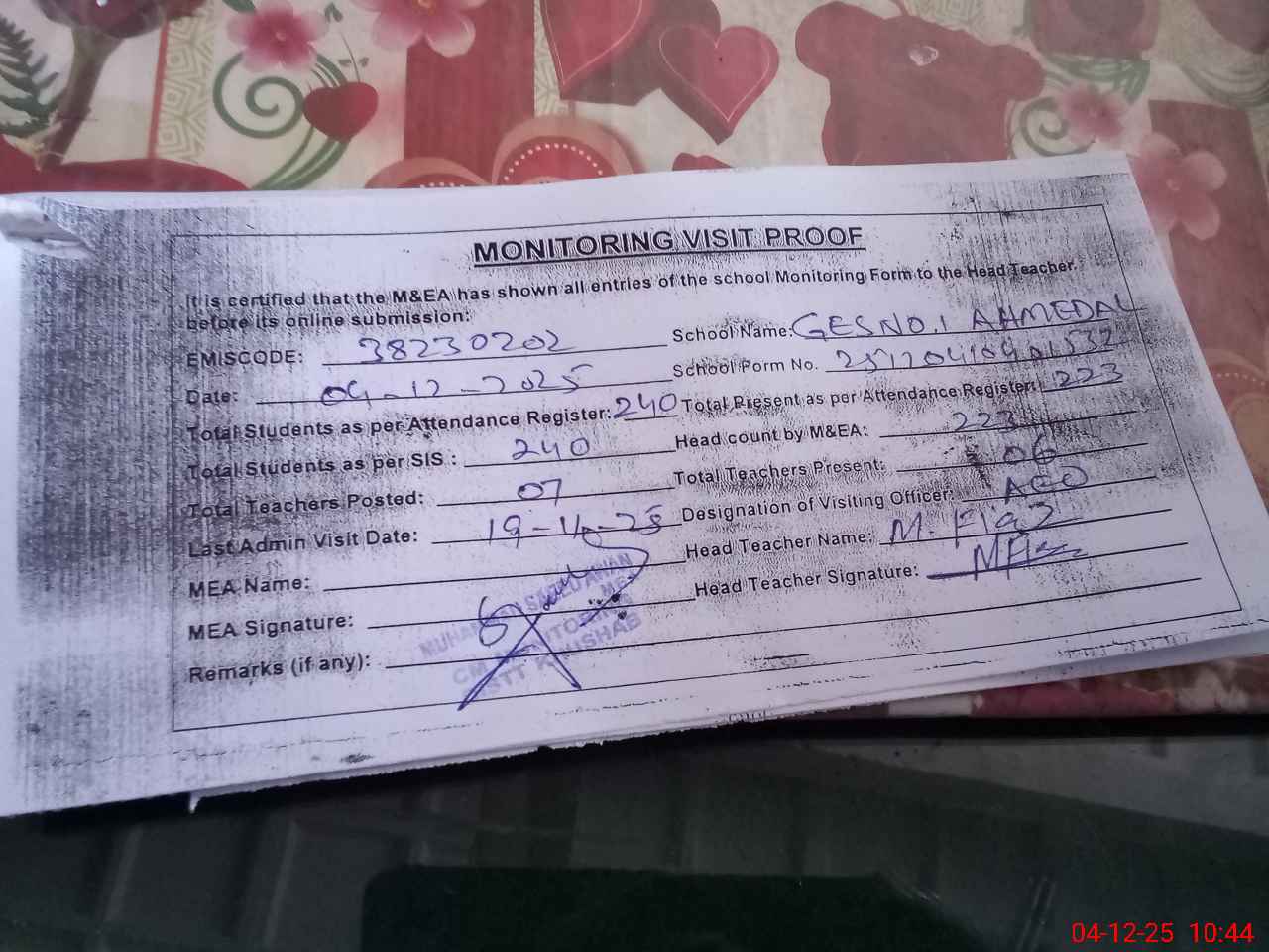 | Remarks (Use Separate Page if Required): Students on SIS QTY 240 Last admin visit On 19 November 2025 by AEO | |||||