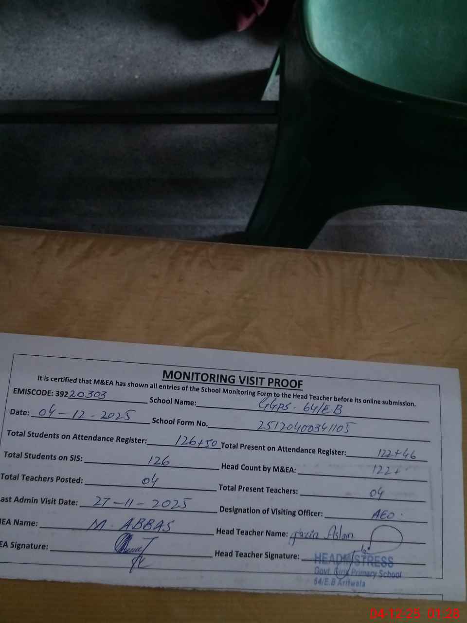 | Attendance Register | Head Teacher | MEA with School | Visit Proof |