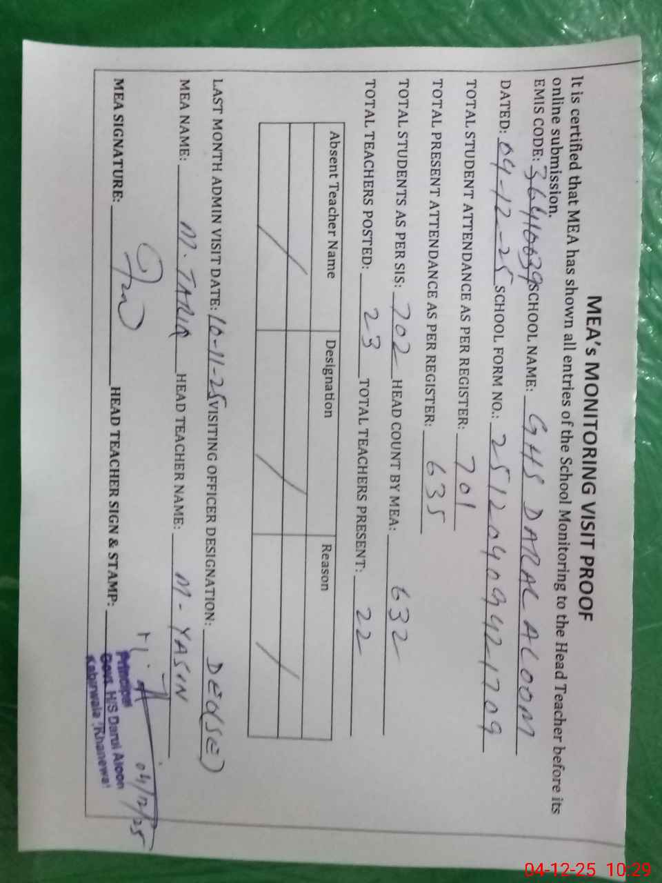 | Attendance Register | Head Teacher | MEA with School | Visit Proof |