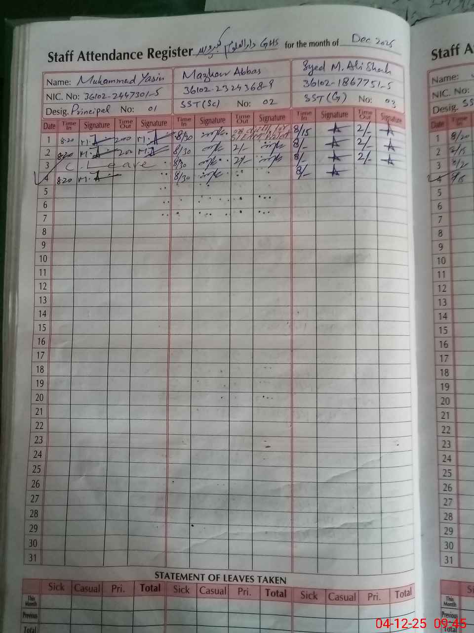 | CNIC | Full Name | Designation | R/C | Absence during last cal. month |