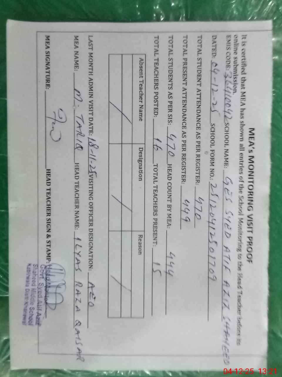 | Attendance Register | Head Teacher | MEA with School | Visit Proof |