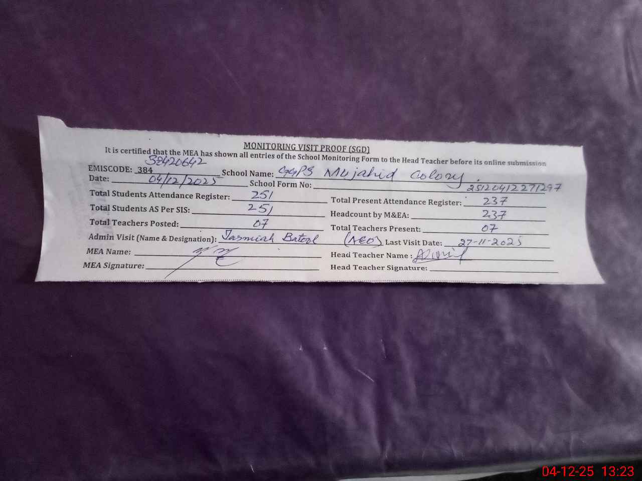 | Attendance Register | Head Teacher | MEA with School | Visit Proof |