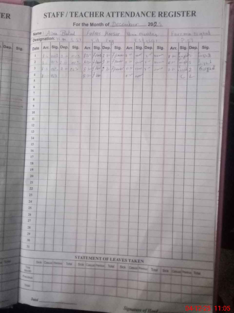 | CNIC | Full Name | Designation | R/C | Absence During Last Calender Month |