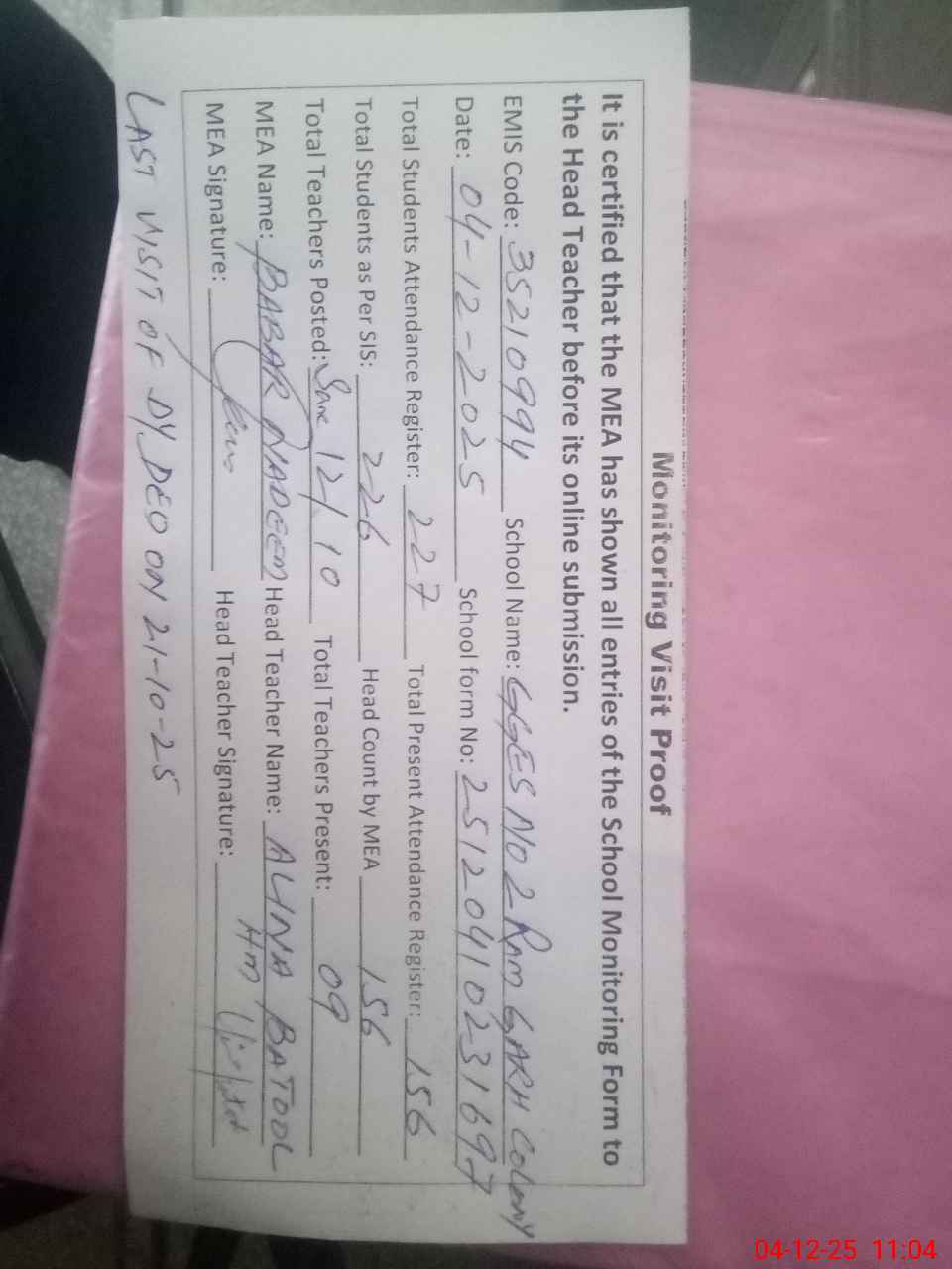 | Attendance Register | Head Teacher | MEA with School | Visit Proof |