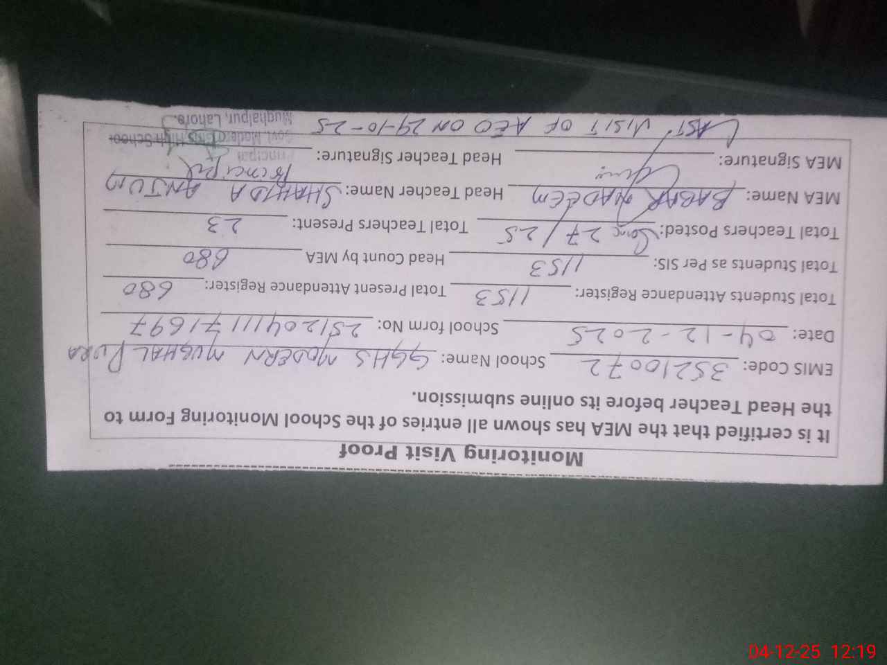 | Attendance Register | Head Teacher | MEA with School | Visit Proof |