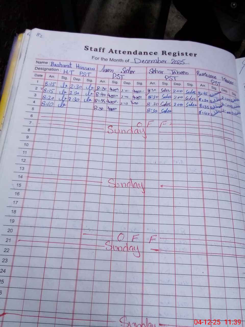 | Remarks (Use Separate Page if Required): 1 Sajid boota Chowkidar shown on causal leave but the leave record not available so marked him absent 2. The electricity was non functional at the time of visit | |||||
