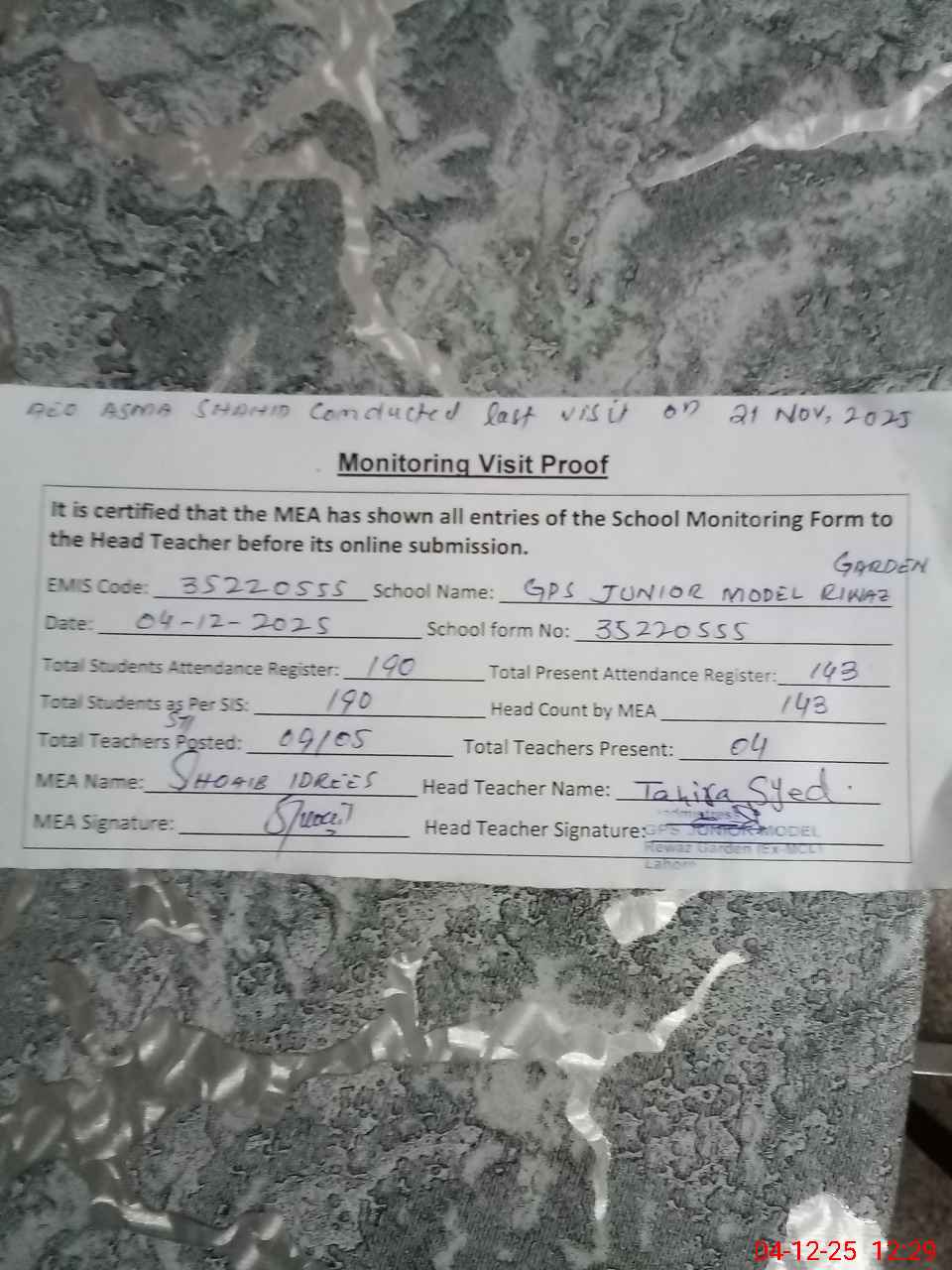| EMIS Code: 35220555 | Name of School: GPS JUNIOR MODEL RIWAZ GARDEN | |||
