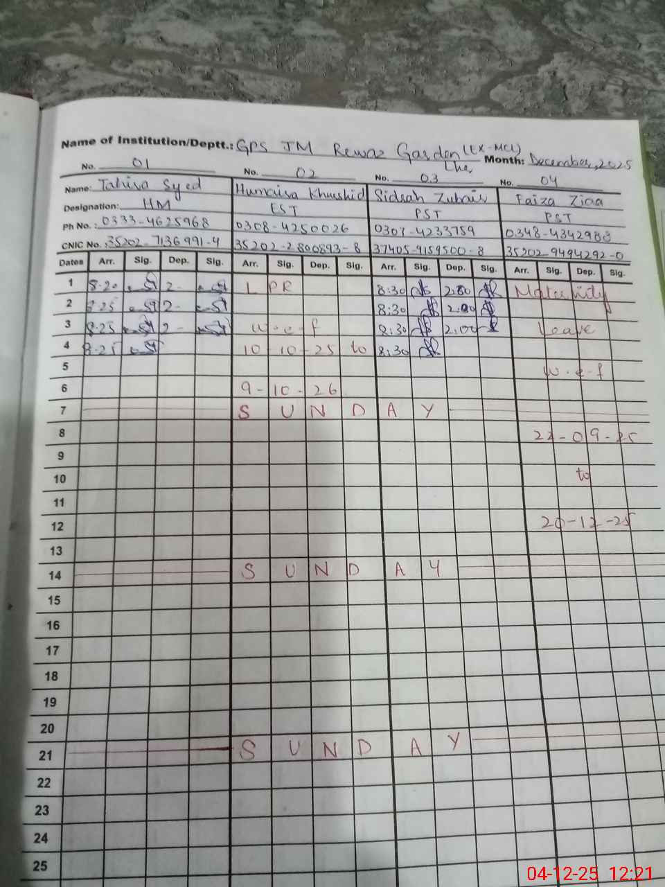| Remarks (Use Separate Page if Required): 1 Sajida Bibi Bulavi on stop gap but the order has been expired on 28 Nov, 2025 so marked her absent | |||||