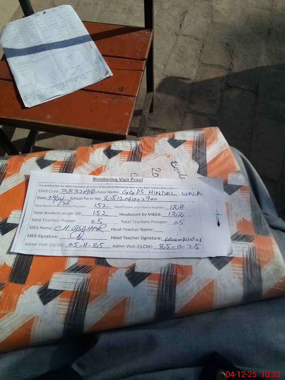 | Attendance Register | Head Teacher | MEA with School | Visit Proof |