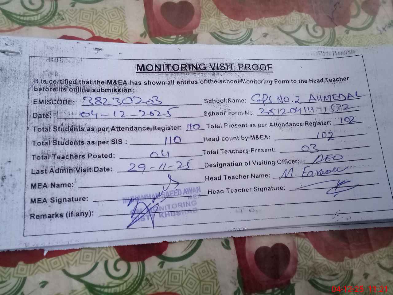 | Remarks (Use Separate Page if Required): Students on SIS QTY 110 Last admin visit On 29 November 2025 by AEO | |||||