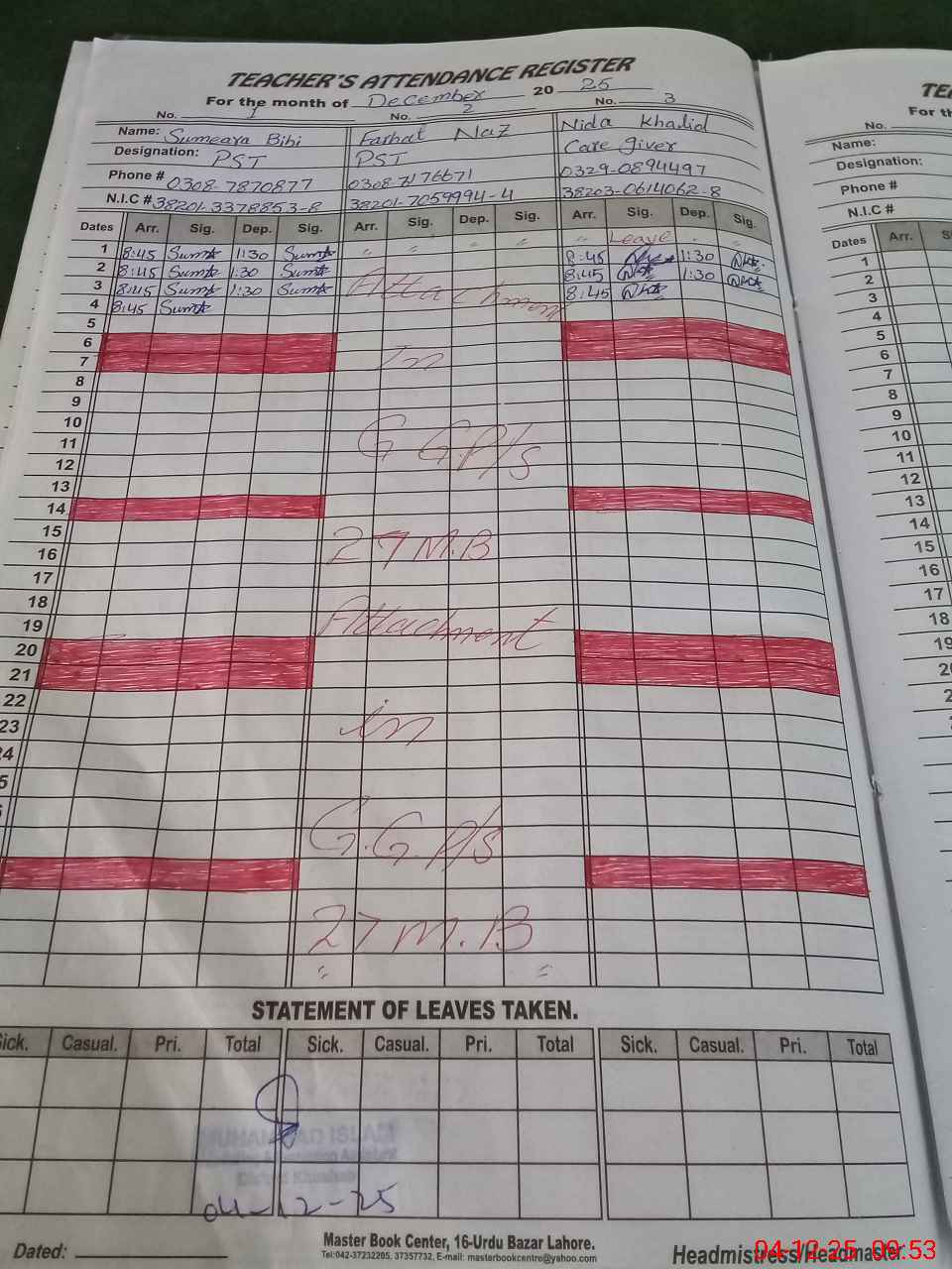 | CNIC | Full Name | Designation | R/C | Absence During Last Calender Month |