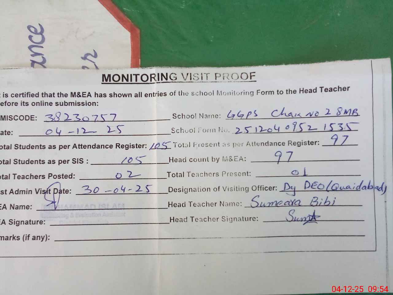 | Remarks (Use Separate Page if Required): Dy DEO visited school on 30 April 2025 Students strength on sis 105 | |||||