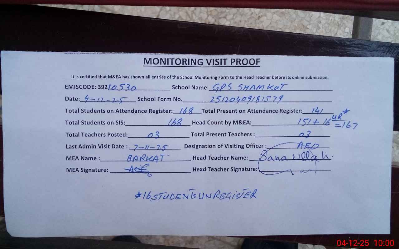 | EMIS Code: 39210530 | Name of School: GPS CHAK SHAM KOT | |||